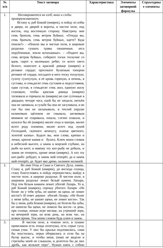 3.Выберите 3 заговора (из предложенных нами или подобранных самостоятельно), в которых попробуйте найти элементы «заговорной формулы».