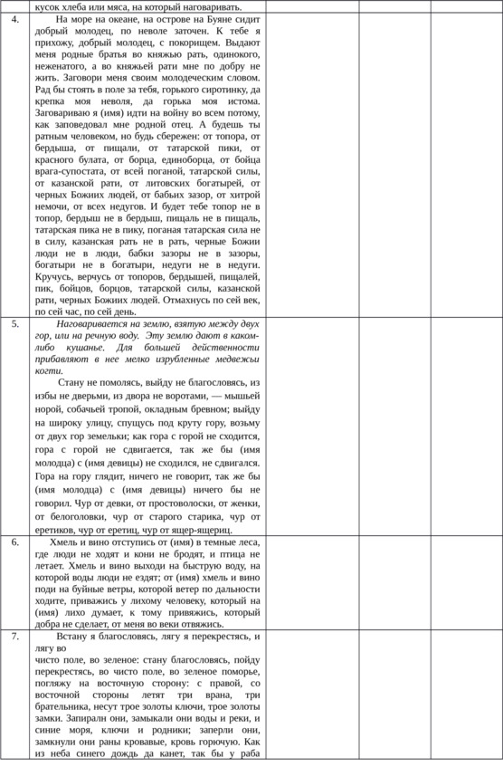 1.Прочитайте внимательно тексты заговоров, которые даны ниже. Пяти из них (на ваш выбор) дайте характеристику на основании предложенных классификаций (А. Майкова, В. Кляуса, А. Гавриловой, Н. Познанского), определите, в каких жизненных ситуациях заговор используется; в каждом заговоре найдите и выпишите элементы заговорной формулы, выделите «задел», «желание», «закрепку».