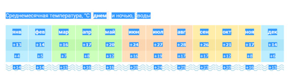 Самое лучшее время – сентябрь-октябрь. Туристы уже разъехались, цены упали, а море все такое же теплое, и солнце ласковое. Зимой загораем, любуясь снежными верхушками гор.