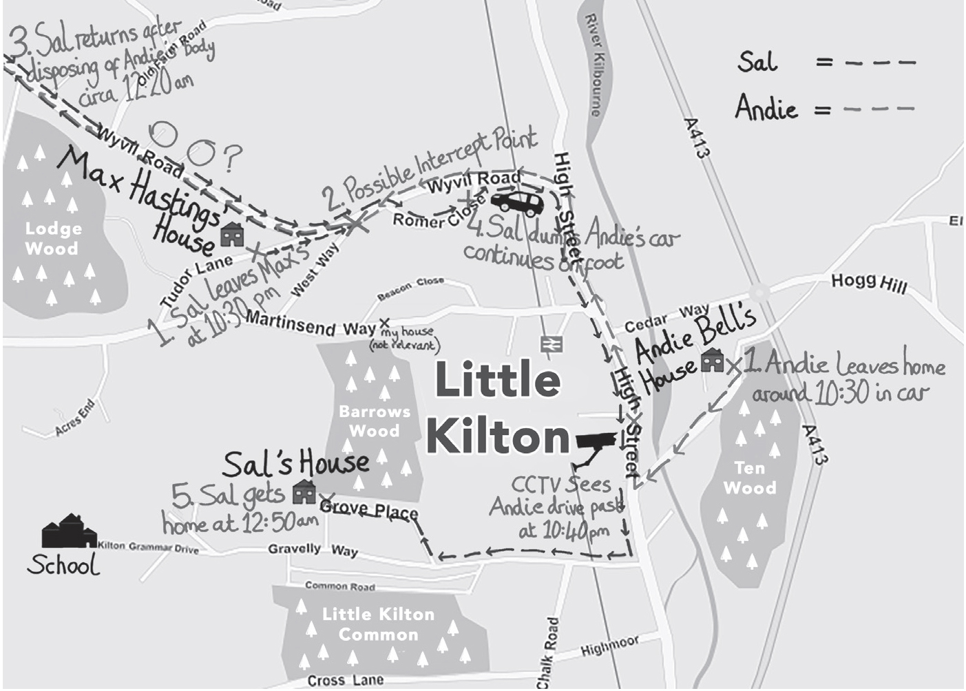 Pip: So, how old are you? Ravi: Why? Pip: Just trying to get all the facts straight. Ravi: OK, Sergeant, I just turned twenty. Pip: (Laughs) [Side note: OH MY GOD, MY LAUGH IS ATROCIOUS ON AUDIO. I’M NEVER LAUGHING AGAIN!] And Sal was three years older than you? Ravi: Yes. Pip: Do you remember your brother acting strangely on Friday the twentieth of April 2012? Ravi: Wow, straight in there. Um, no, not at all. We had an early dinner at, like, seven before my dad dropped him at Max’s, and he was just chatting along, like normal Sal. If he was secretly planning a murder, it wasn’t at all obvious to us. He was . . . chirpy, I’d say was a good description. Pip: And what about when he returned from Max’s? Ravi: I had already gone up to bed. But the next morning, I remember him being in a really good mood. Sal was always a morning person. He got up and made breakfast for us all and it wasn’t until just after that he got a phone call from one of Andie’s friends. That’s when we all found out she was missing. From that point, obviously, he wasn’t chirpy any more, he was worried. Pip: So neither Andie’s parents nor the police rang him during Friday night? Ravi: Not that I know of. Andie’s parents didn’t really know Sal. He’d never met them or been to their house. Andie usually came around here or they hung out at school and parties. Pip: How long had they been together? Ravi: Since just before Christmas the year before, so about four months. Sal did have a couple of missed calls from one of Andie’s best friends at, like, 2 a.m. that night. His phone was on silent, though, so he slept through them. Pip: So what else happened on that Saturday? Ravi: Well, after finding out Andie was missing, Sal literally sat on the phone, calling her every few minutes. It went to voicemail each time, but he figured if she’d pick up for anyone, it’d be him. Pip: Wait, so Sal was calling Andie’s phone? Ravi: Yeah, like a million times, throughout that weekend and on the Monday too. Pip: Doesn’t sound like the kind of thing you’d do if you knew you had murdered the person and they would never pick up. Ravi: Especially if he had her phone hidden somewhere on him, or in his room. Pip: An even better point. So what else happened that day? Ravi: My parents told him not to go to Andie’s house, because the police would be busy searching it. So he just sat at home, trying to call her. I asked him if he had any idea where she’d be, and he was stumped. He said something else I always remembered. He said that everything Andie did was deliberate, and maybe she’d run off on purpose to punish someone. Obviously by the end of the weekend he realized that probably wasn’t the case. Pip: Who would Andie be wanting to punish? Him? Ravi: I don’t know, I didn’t push it. I didn’t know her well; she only came around a handful of times. I mean, I presumed the ‘someone’ Sal was talking about was Andie’s dad. Pip: Jason Bell? Why? Ravi: I just overheard some stuff when she was here. I figured she didn’t have the best relationship with her dad. I can’t remember anything specifically. [Phew, he says ‘specifically’ not ‘pacifically’.] Pip: Specifics are what we need. So when did the police contact Sal? Ravi: It was that Saturday afternoon. They called him and asked if they could come over for a chat. They arrived at, like, three or four-ish. Me and my parents came into the kitchen to give them a bit of space, so we didn’t hear any of it really. Pip: And did Sal tell you what they asked him? Ravi: A bit. He was a little freaked out that they recorded it and st– Pip: The police recorded it? Is that normal? Ravi: I don’t know, you’re the sergeant. They said it was routine and just asked him questions about where he was that night, who he was with. And about his and Andie’s relationship. Pip: And what was their relationship like? Ravi: I’m his brother; I didn’t see all that much of it. But, yeah, Sal liked her a lot. I mean, he seemed pretty chuffed he was with the prettiest, most popular girl in the year. Andie always seemed to bring drama, though. Pip: What kind of drama? Ravi: I don’t know, I think she was just one of those people who thrives on it. Pip: Did your parents like her? Ravi: Yeah, my parents were cool with her. She never gave them a reason not to be. Pip: And so what else happened after the police interviewed him? Ravi: Err, his friends came around in the evening, you know to check if he was OK. Pip: And is that when he asked his friends to lie to the police and give him an alibi? Ravi: I guess so. Pip: Why do you think he did that? Ravi: I mean, I don’t know. Maybe he was rattled after the police interview. Maybe he was scared he would be a suspect so he tried to cover himself. I don’t know. Pip: Presuming Sal’s innocence, do you have any idea where he could have been between leaving Max’s at 10:30 and getting home at 12:50? Ravi: No, because he also told us that he started walking home from Max’s at like 12:15. I guess maybe he was alone somewhere so he knew that if he told the truth he’d have no alibi. It looks bad, doesn’t it? Pip: I mean, lying to the police and asking his friends to as well does look bad for Sal. But it’s not absolute proof that he had anything to do with Andie’s death. So what happened on the Sunday then? Ravi: On the Sunday afternoon, me, Sal and his friends volunteered to help put up some missing posters, handing them out to people in town. On the Monday, I didn’t see much of him at school, but it must have been pretty hard for him because all anyone was talking about was Andie’s disappearance. Pip: I remember. Ravi: Police were about too; I saw them looking through Andie’s locker. Yeah, so that night he was a little down. He was quiet, but he was worried, that’s what you’d expect. His girlfriend was missing. And the next day – Pip: You don’t have to talk about the next day if you don’t want