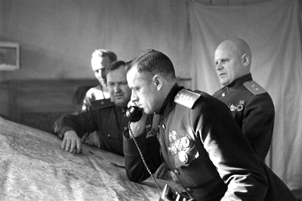 Штаб Белорусского фронта. 5 февраля 1944. Слева-направо: начальник инженерного управления А.И. Прошляков, начальник оперативного управления И.И. Бойков, командующий фронтом К.К. Рокоссовский, член Военного совета фронта К.Ф. Телегин