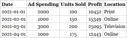 Table 2.1 tells the story of a company. Each month, they run a different marketing campaign online, on television, or in print media (newspapers and magazines). The process they run generates new information each month. The table they've created is an encoding of this information and thus it holds data.