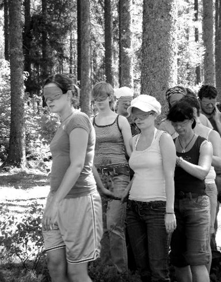 (Bei dieser Übung muss die Gruppe mit verbundenen Augen eine in mehrere Teilabschnitte aufgeteilte Strecke nur mit Hilfe von Erinnerungen an bestimmte Geländemerkmale ablaufen. Im Vorfeld hatte die Gruppe sehend eine bestimmte Vorbereitungszeit um sich die Strecke einzuprägen.)