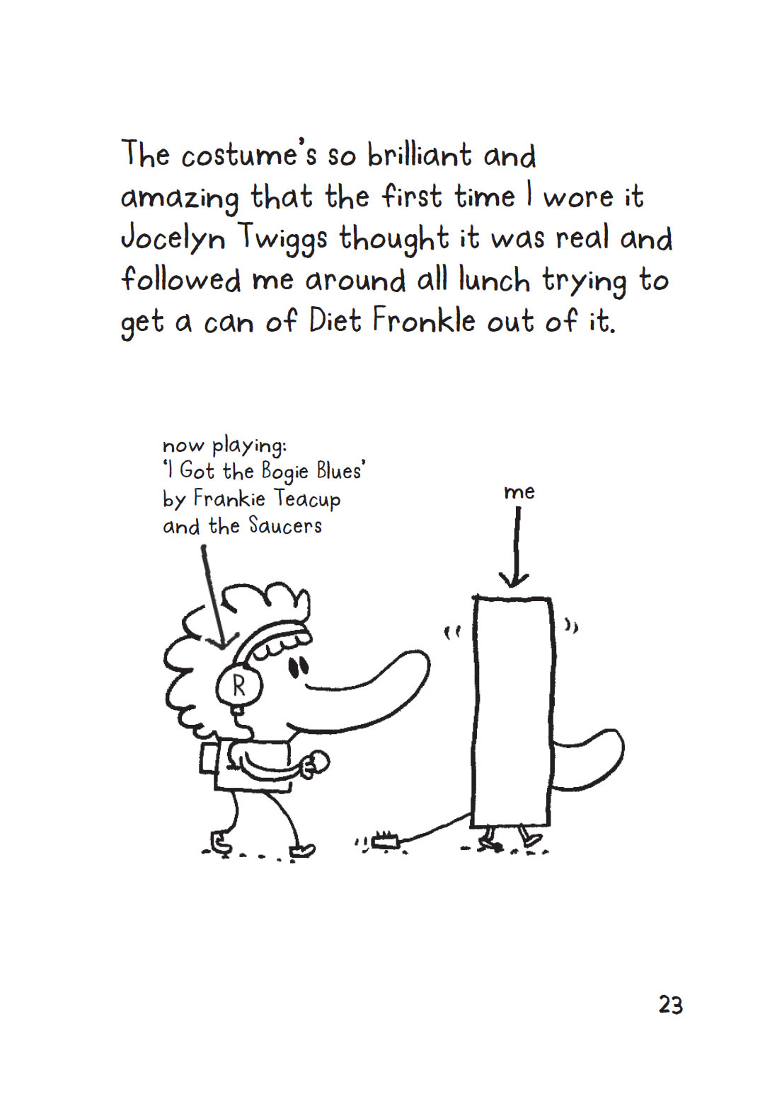 The costume's so brilliant and amazing that the first time I wore it Jocelyn Twiggs thought it was real and followed me around all lunch trying to get a can of Diet Fronkle out of it.