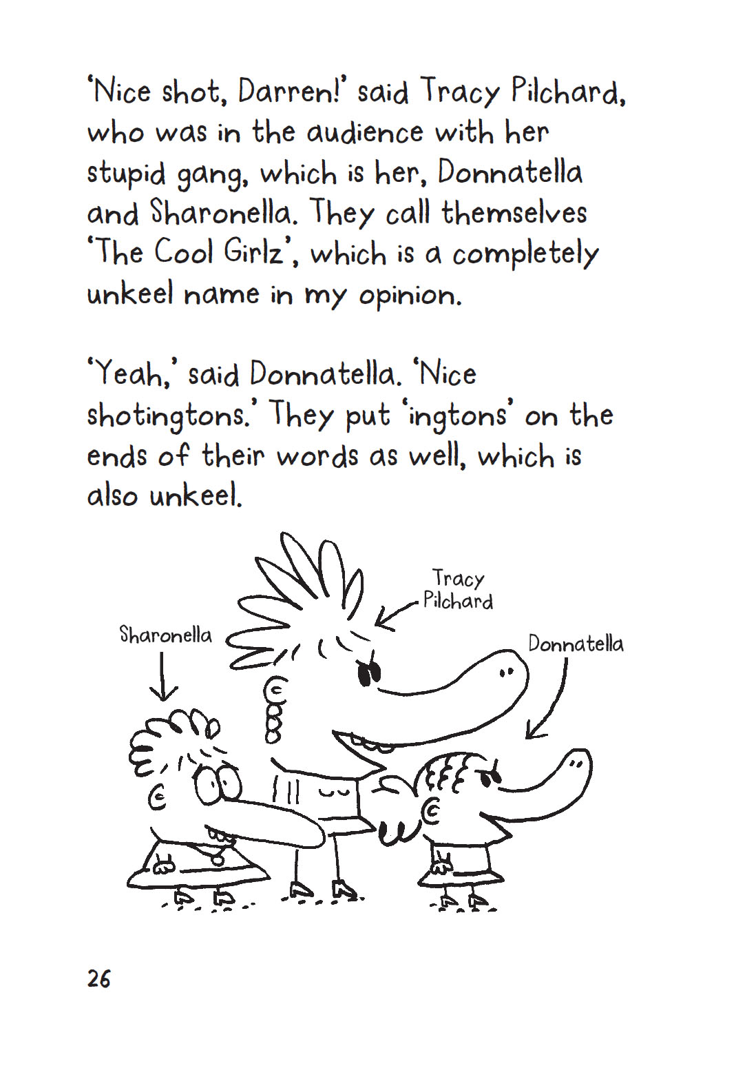'Nice shot, Darren!' said Tracy Pilchard, who was in the audience with her stupid gang, which is her, Donnatella and Sharonella. They call themselves 'The Cool Girlz', which is a completely unkeel name in my opinion.