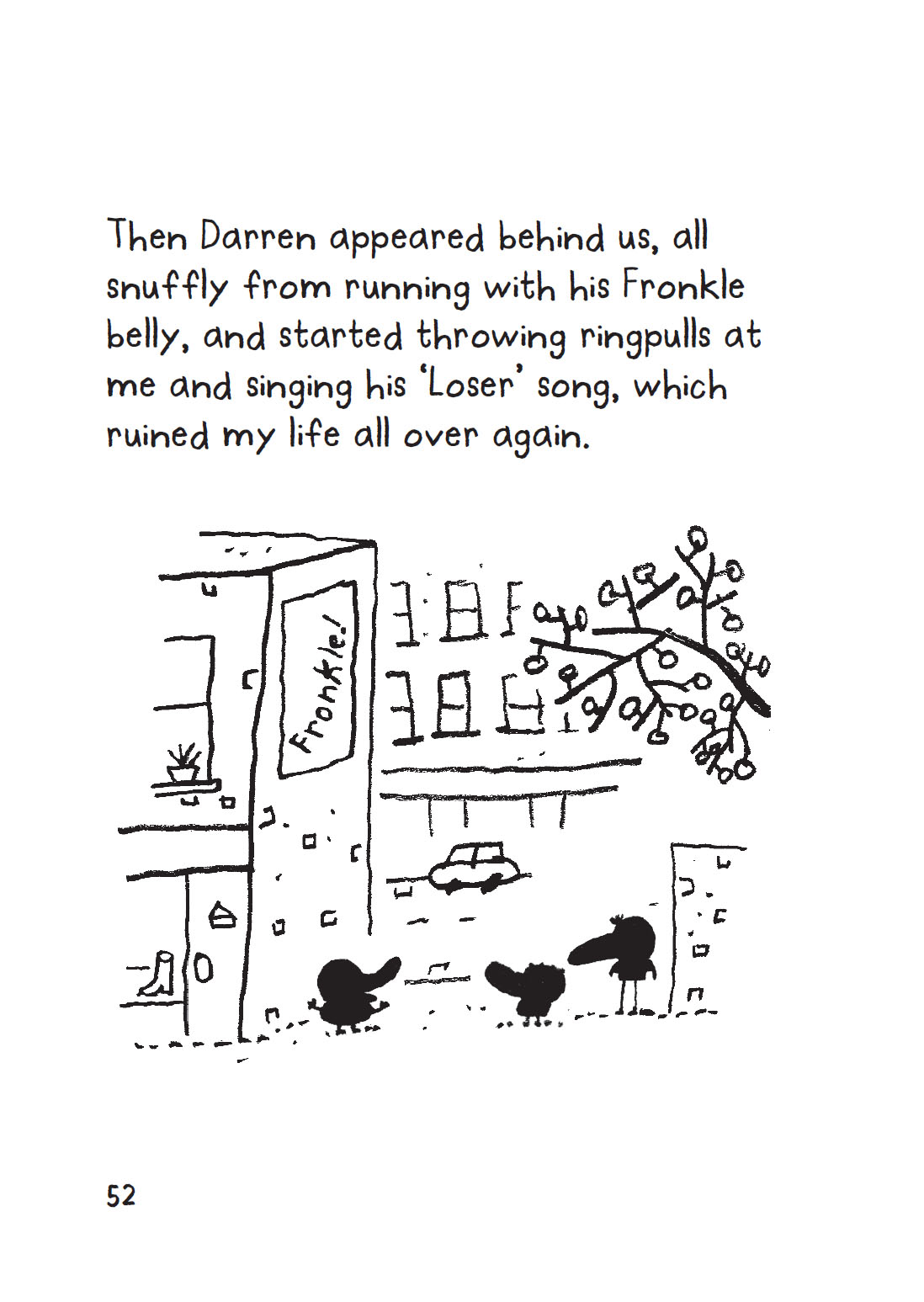 Then Darren appeared behind us, all snuffly from running with his Fronkle belly, and started throwing ringpulls at me and singing his 'Loser' song, which ruined my life all over again.