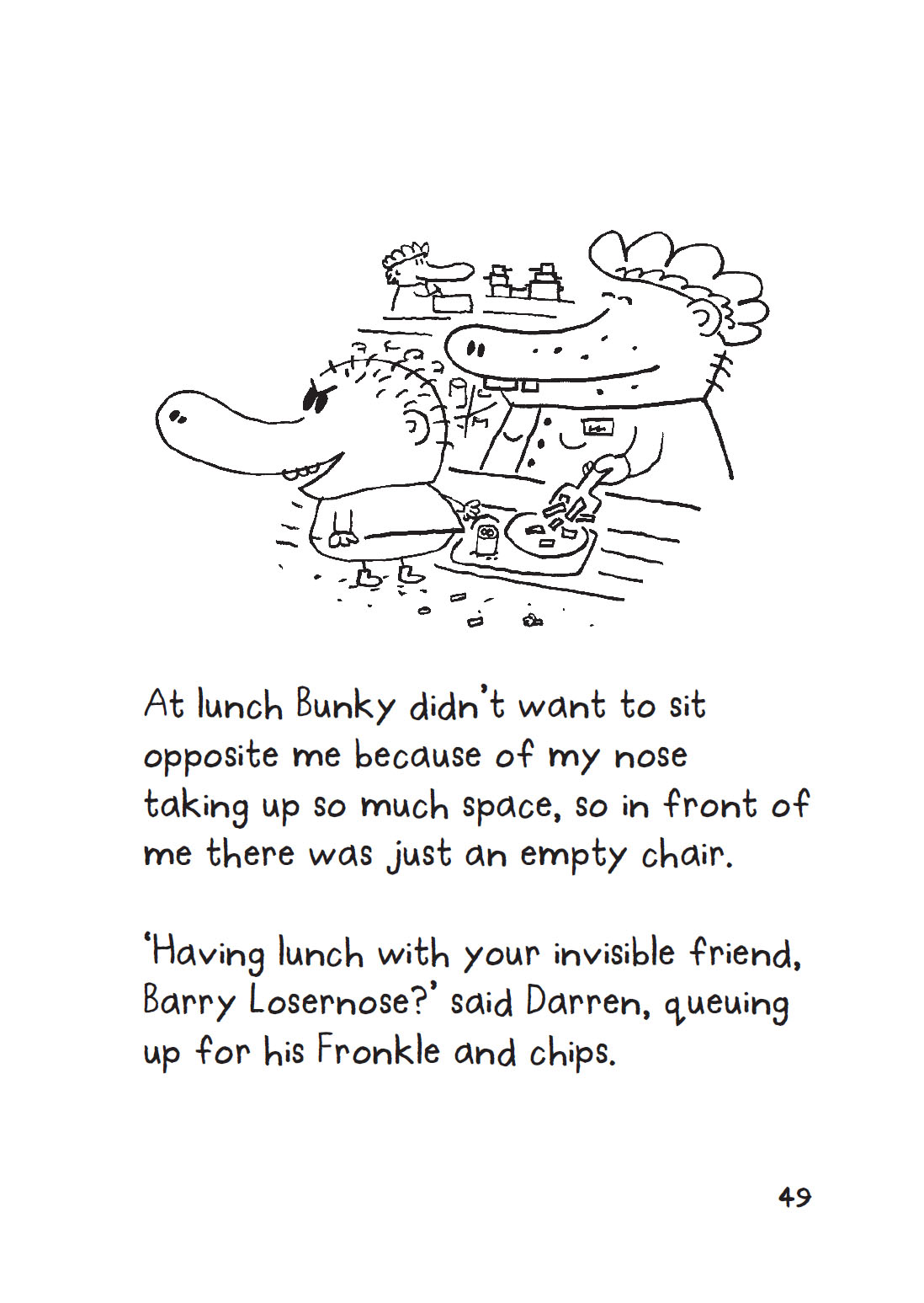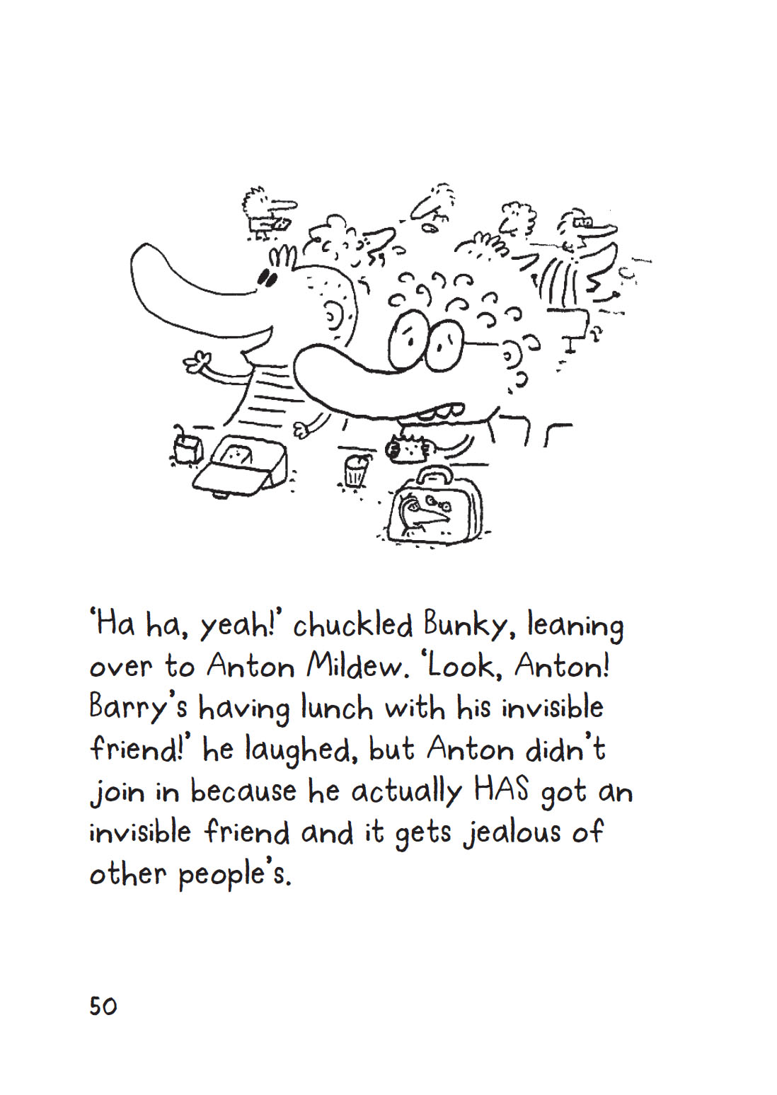 'Ha ha, yeah!' chuckled Bunky, leaning over to Anton Mildew. 'Look, Anton! Barry's having lunch with his invisible friend!' he laughed, but Anton didn't join in because he actually HAS got an invisible friend and it gets jealous of other people's.