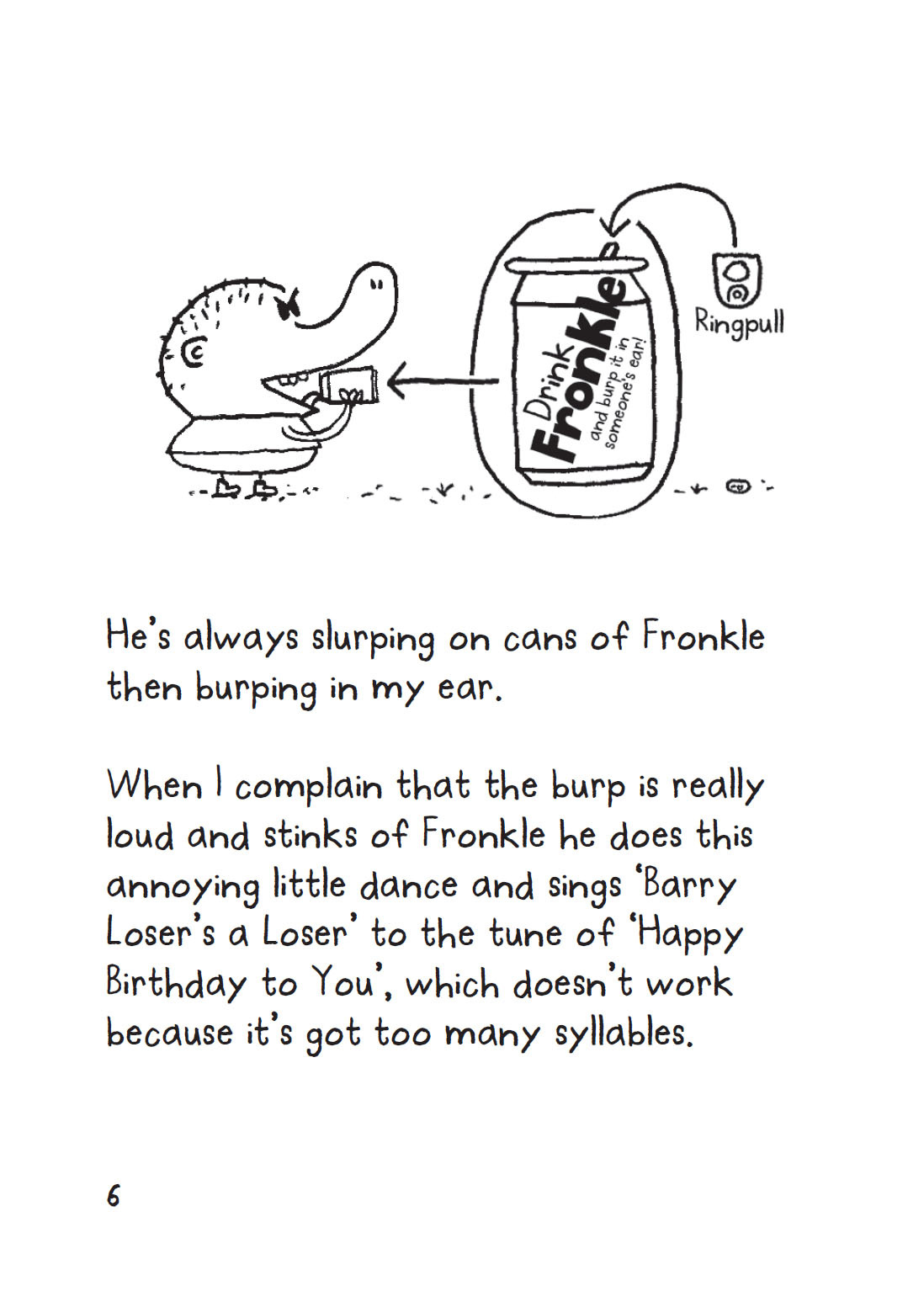 When I complain that the burp is really loud and stinks of Fronkle he does this annoying little dance and sings 'Barry Loser's a Loser' to the tune of 'Happy Birthday to You', which doesn't work because it's got too many syllables.