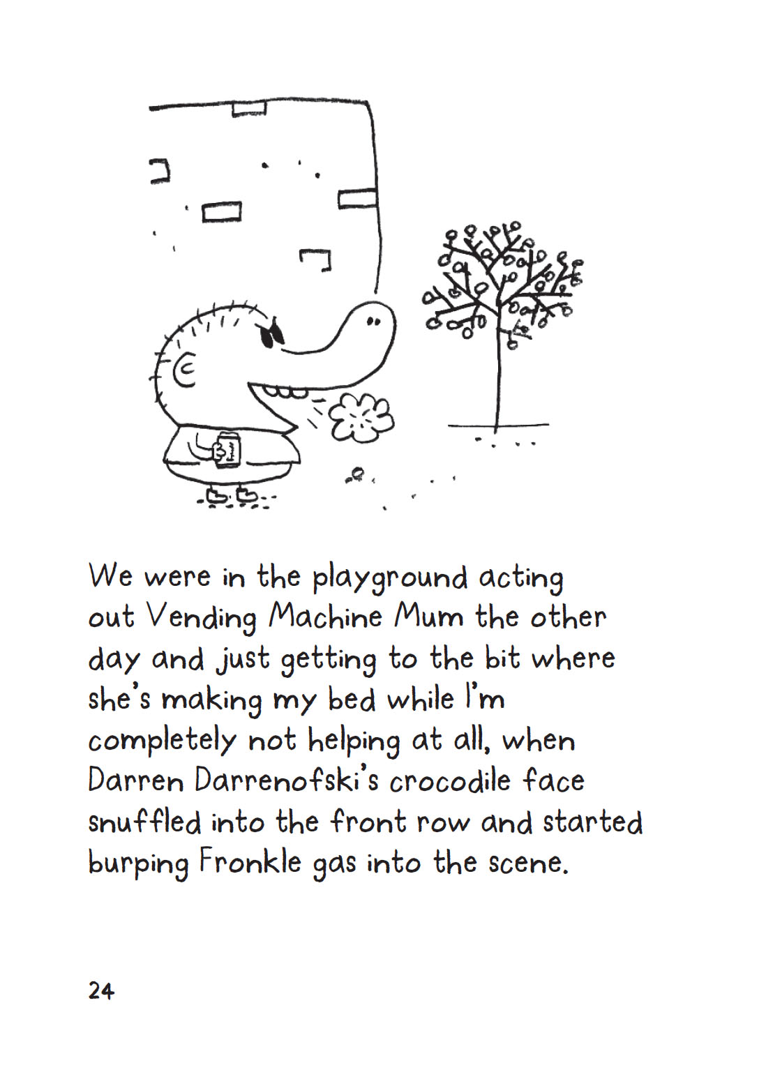 We were in the playground acting out Vending Machine Mum the other day and just getting to the bit where she's making my bed while I'm completely not helping at all, when Darren Darrenofski's crocodile face snuffled into the front row and started burping Fronkle gas into the scene.