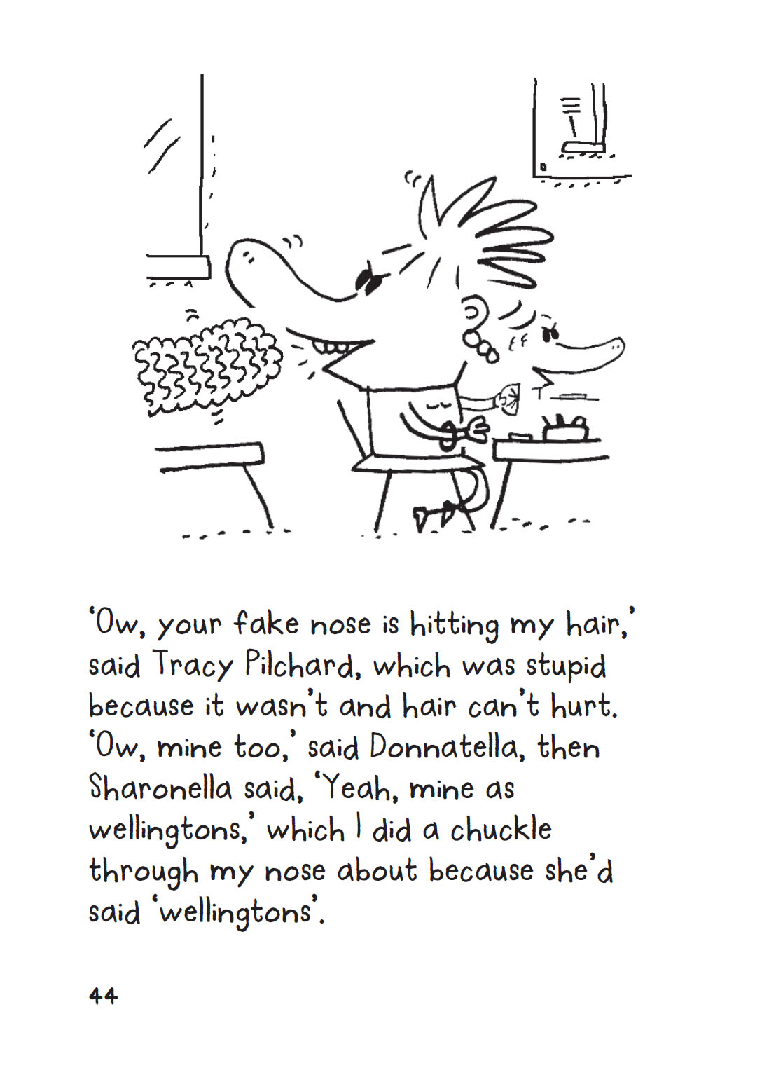 'Ow, your fake nose is hitting my hair,' said Tracy Pilchard, which was stupid because it wasn't and hair can't hurt. 'Ow, mine too,' said Donnatella, then Sharonella said, 'Yeah, mine as wellingtons,' which I did a chuckle through my nose about because she'd said 'wellingtons'.