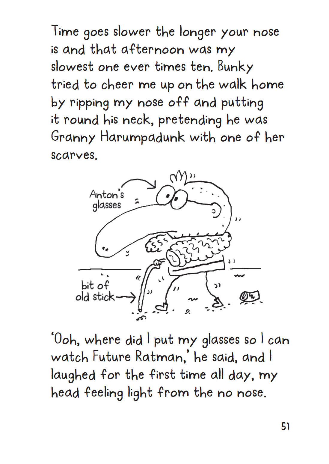 Time goes slower the longer your nose is and that afternoon was my slowest one ever times ten. Bunky tried to cheer me up on the walk home by ripping my nose off and putting it round his neck, pretending he was Granny Harumpadunk with one of her scarves.