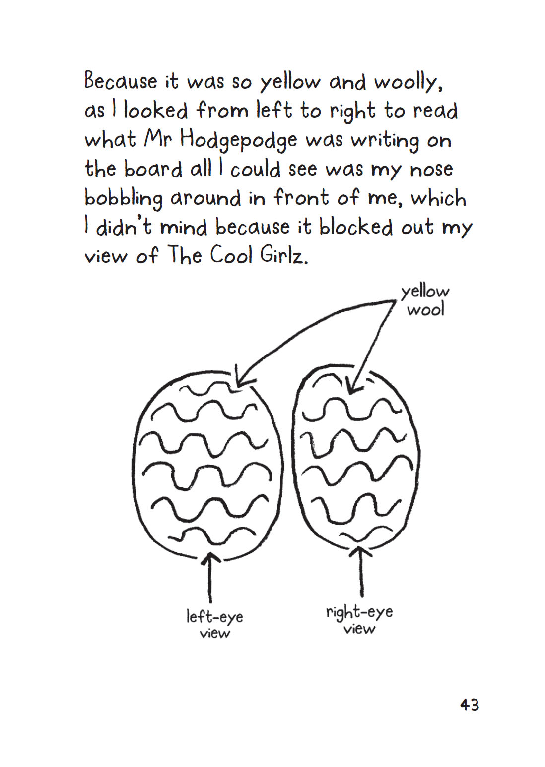 Because it was so yellow and woolly, as I looked from left to right to read what Mr Hodgepodge was writing on the board all I could see was my nose bobbling around in front of me, which I didn't mind because it blocked out my view of The Cool Girlz.