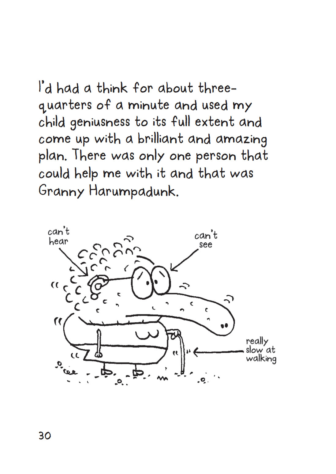 I'd had a think for about three- quarters of a minute and used my child geniusness to its full extent and come up with a brilliant and amazing plan. There was only one person that could help me with it and that was Granny Harumpadunk.