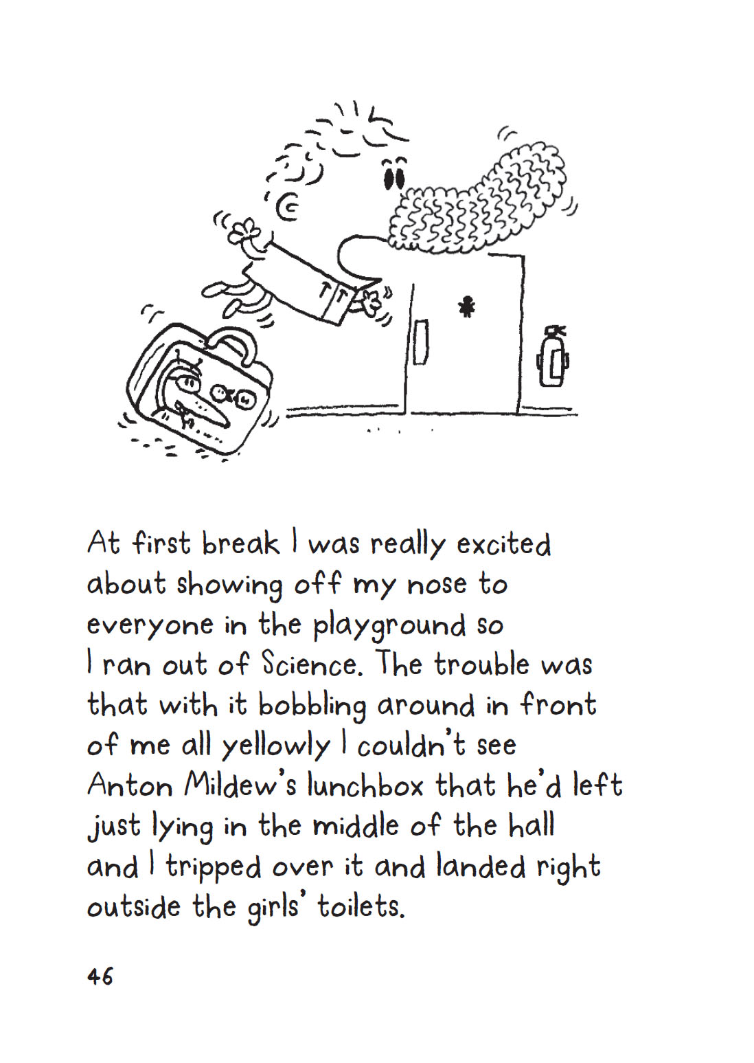 At first break I was really excited about showing off my nose to everyone in the playground so I ran out of Science. The trouble was that with it bobbling around in front of me all yellowly I couldn't see Anton Mildew's lunchbox that he'd left just lying in the middle of the hall and I tripped over it and landed right outside the girls' toilets.