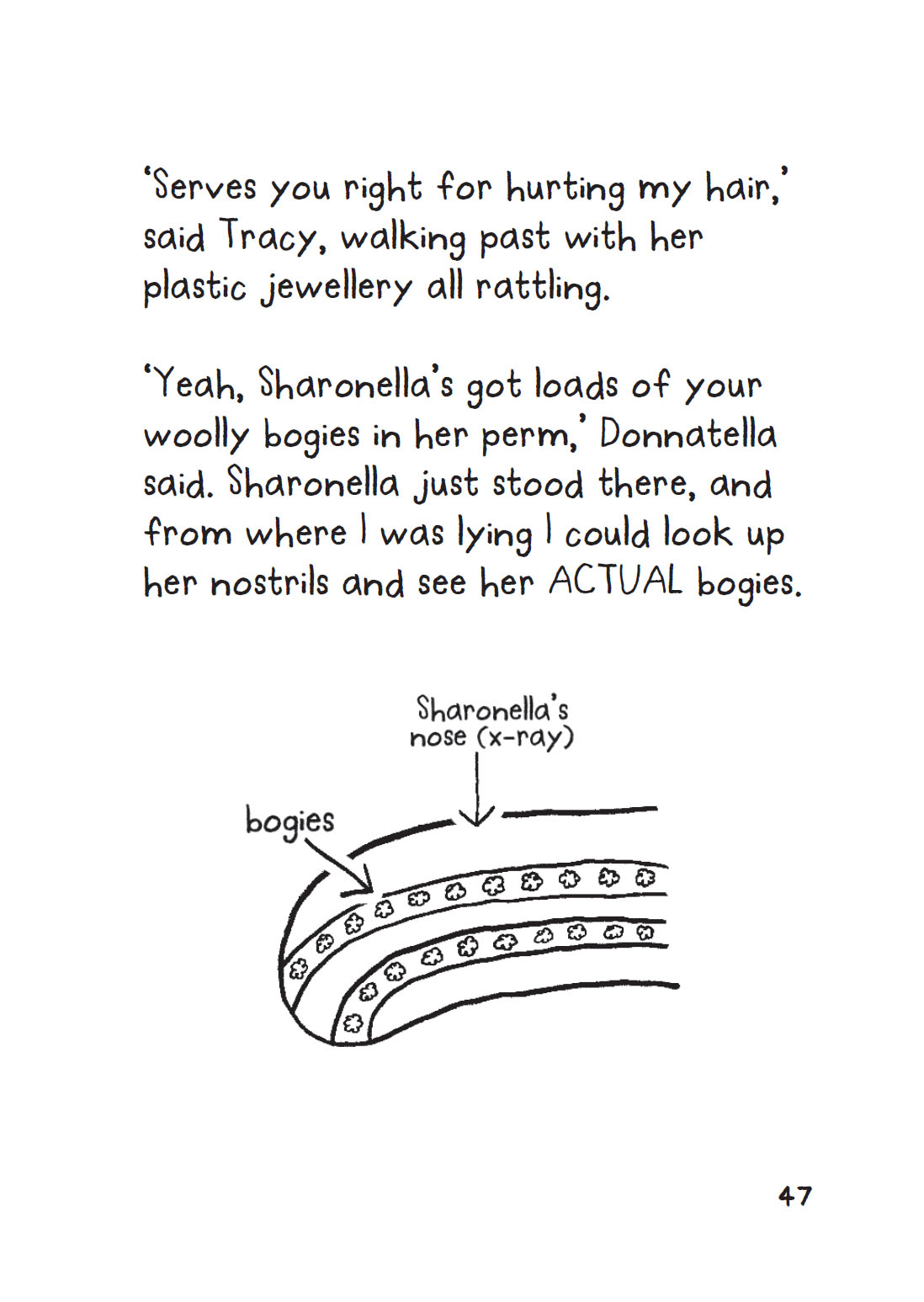 'Yeah, Sharonella's got loads of your woolly bogies in her perm,' Donnatella said. Sharonella just stood there, and from where I was lying I could look up her nostrils and see her ACTUAL bogies.