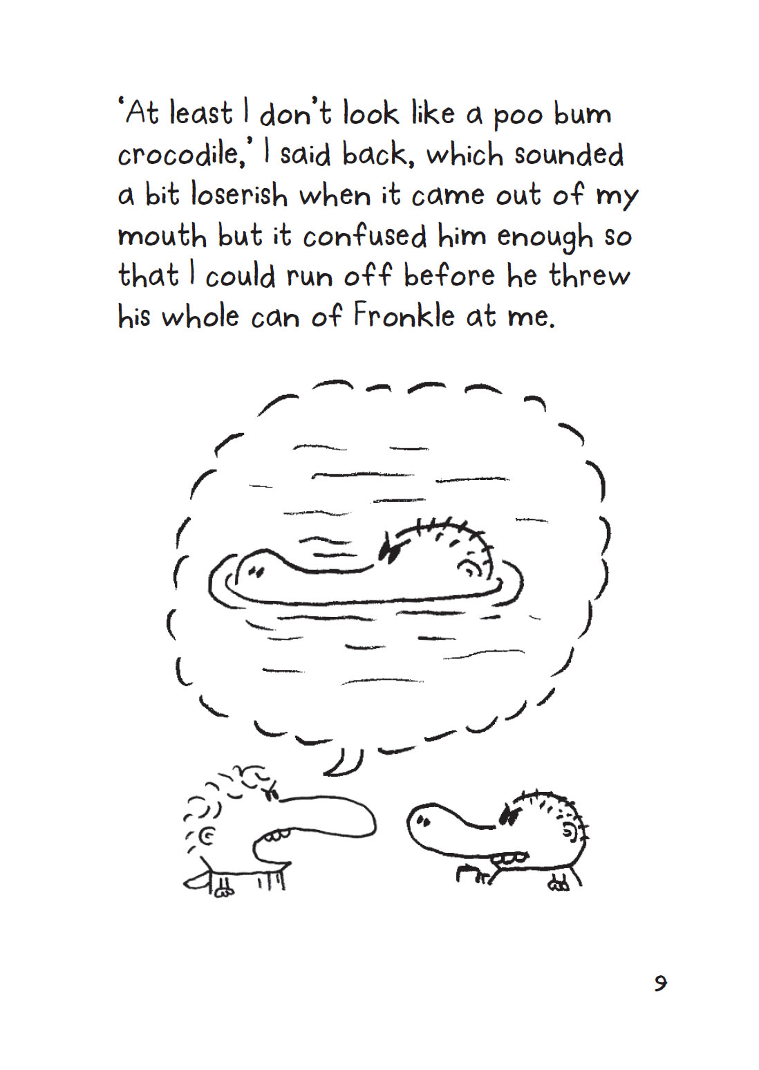 'At least I don't look like a poo bum crocodile,' I said back, which sounded a bit loserish when it came out of my mouth but it confused him enough so that I could run off before he threw his whole can of Fronkle at me.