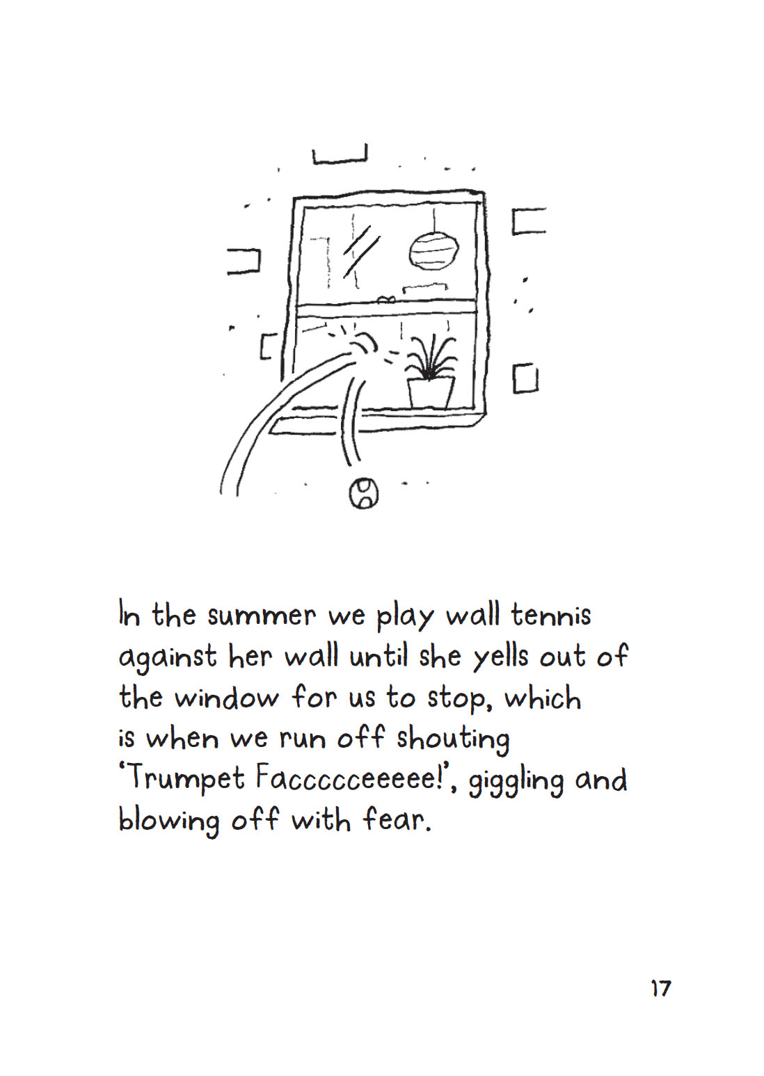 In the summer we play wall tennis against her wall until she yells out of the window for us to stop, which is when we run off shouting 'Trumpet Faccccceeeee!', giggling and blowing off with fear.