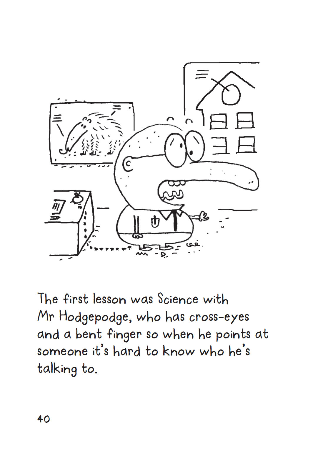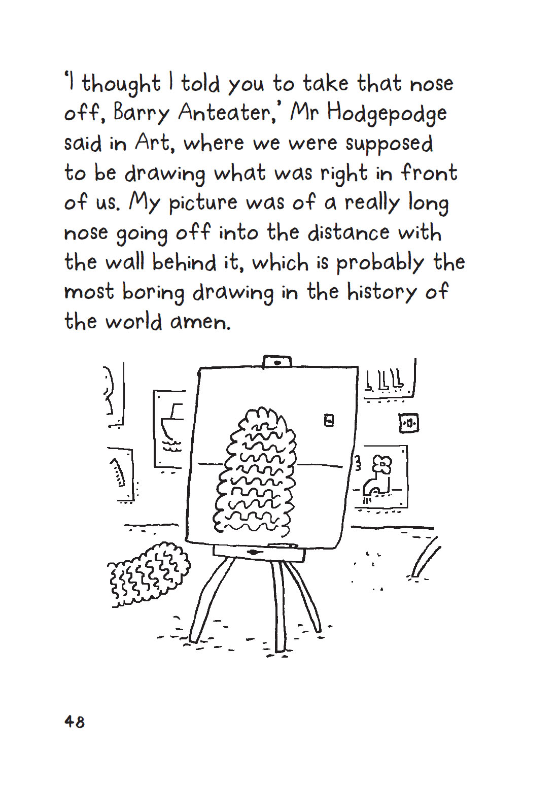 'I thought I told you to take that nose off, Barry Anteater,' Mr Hodgepodge said in Art, where we were supposed to be drawing what was right in front of us. My picture was of a really long nose going off into the distance with the wall behind it, which is probably the most boring drawing in the history of the world amen.