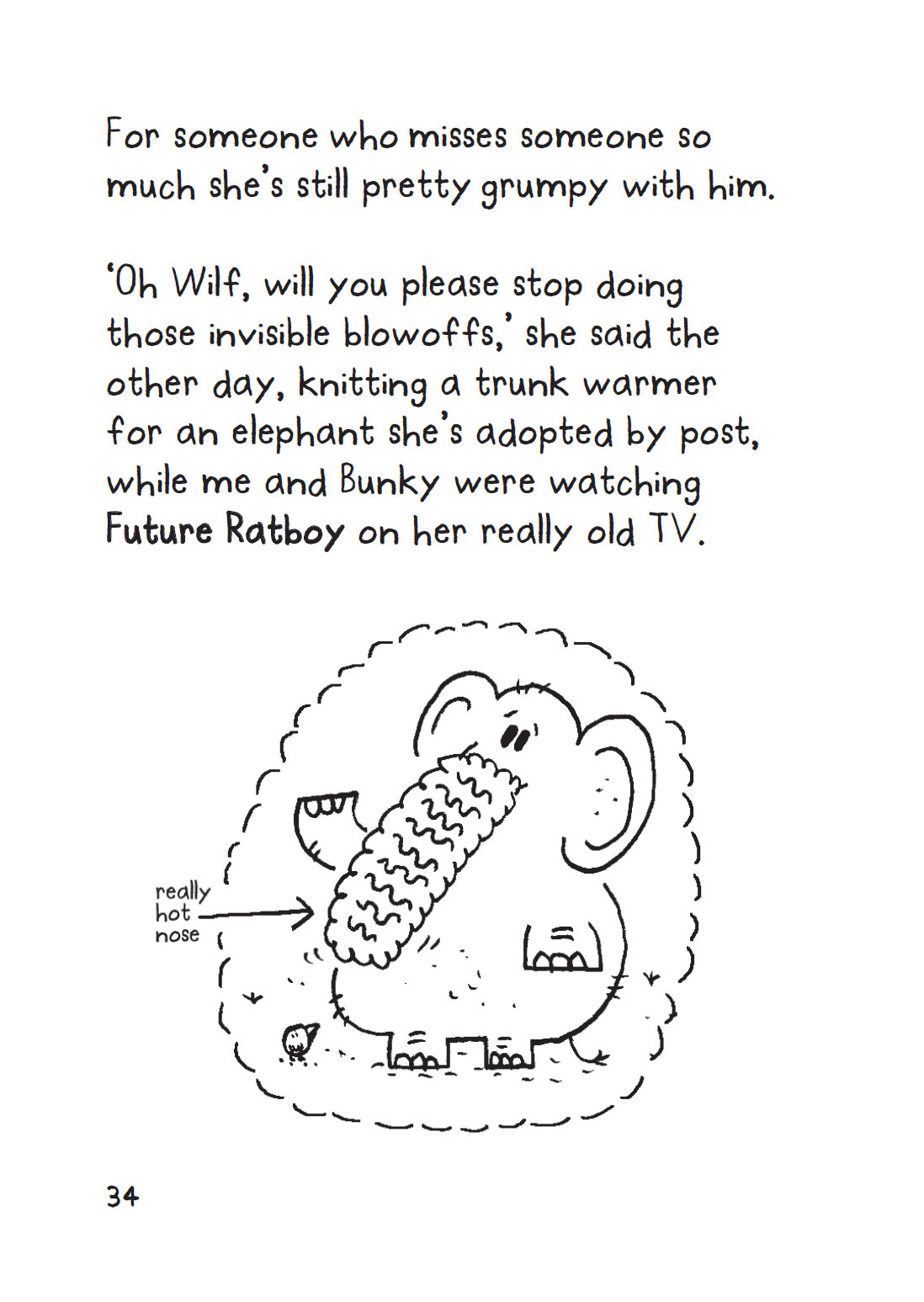 'Oh Wilf, will you please stop doing those invisible blowoffs,' she said the other day, knitting a trunk warmer for an elephant she's adopted by post, while me and Bunky were watching Future Ratboy on her really old TV.