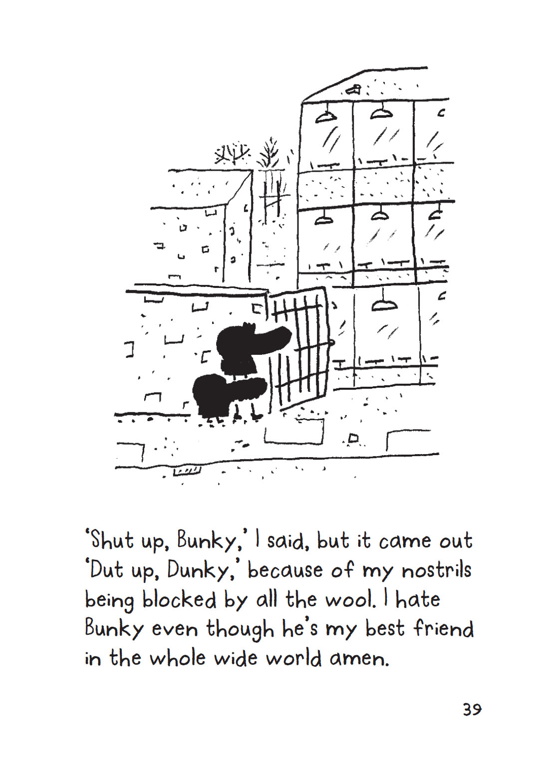 'Shut up, Bunky,' I said, but it came out 'Dut up, Dunky,' because of my nostrils being blocked by all the wool. I hate Bunky even though he's my best friend in the whole wide world amen.
