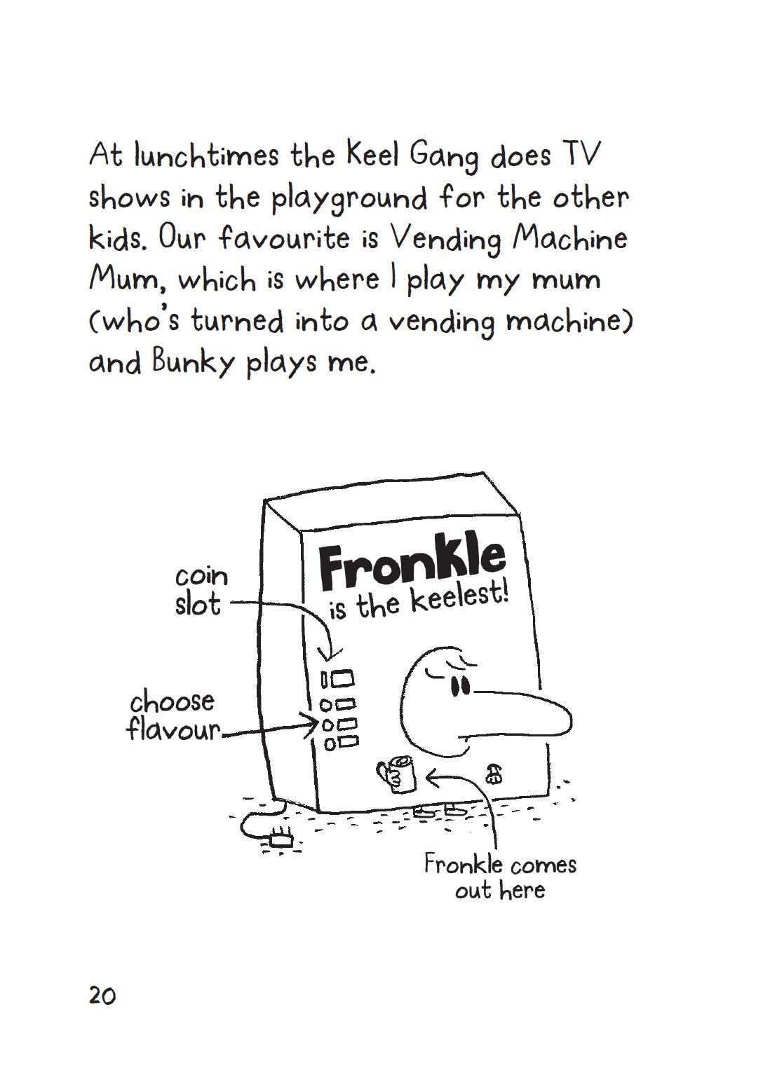 At lunchtimes the Keel Gang does TV shows in the playground for the other kids. Our favourite is Vending Machine Mum, which is where I play my mum (who's turned into a vending machine) and Bunky plays me.