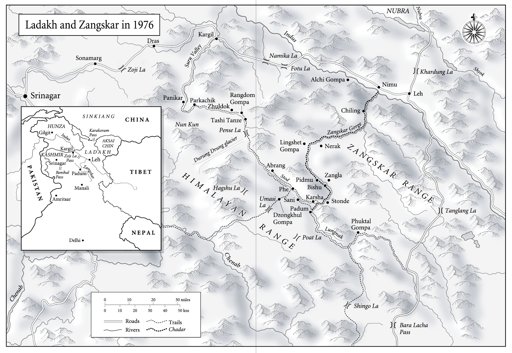 Ladakh, known as ‘Little Tibet’, ‘Western Tibet’, ‘Indian Tibet’ or the ‘Land of High Passes’, is a remote Himalayan kingdom about four times the size of Wales. The four major mountain ranges that run through Ladakh are subdivided into small, secluded valleys. It is one of the highest inhabited places in the world, a remarkable enclave and a fine tribute to the inhabitants’ farming skills. These mountains are also crucial to Zangskar’s seclusion and individuality. The lowest pass into Zangskar from the west is at 14,500ft and the highest from the south over the main Himalayan range is over 18,000ft and only open for one or two months in the summer. These higher routes often cross glaciers riddled with crevasses. There is no easy way into Zangskar, and no easy way out.