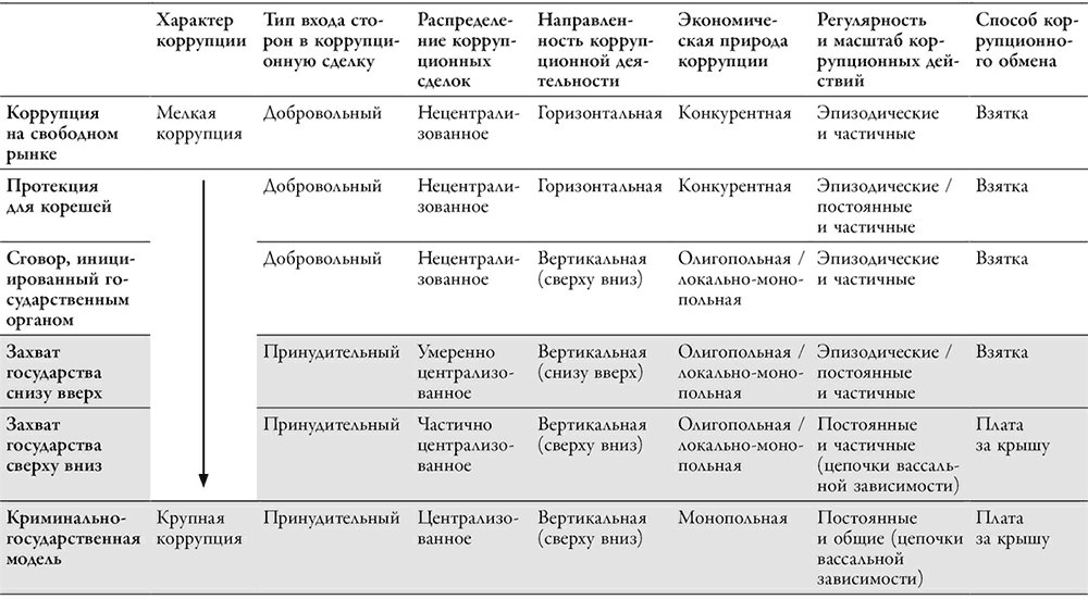 Таблица 5.2: Главные характеристики шести типов коррупции (типы принудительной коррупции отмечены серым цветом)