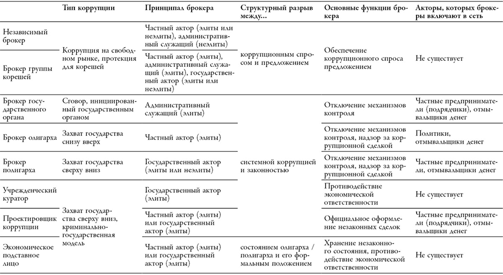 Тогда как структурные разрывы в целом можно найти в основании любого типа коррупции, различные ее формы содержат разные типы этих разрывов, и потому для проведения сделок используются разные типы брокеров-коррупционеров. В Таблице 5.3[71] приведена их типология с указанием (1) типа коррупции, для которого их участие наиболее характерно; (2) их принципала, то есть персоны идеального типа, на которую они работают; (3) структурных разрывов, требующих посредничества; (4) их основных функций и (5) акторов, которых брокеры включают в сеть, чтобы преодолеть структурный разрыв и сделать коррупционную сделку, а также извлечение из нее прибыли возможными.