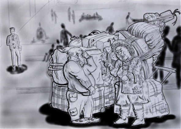 Внезапно его взгляд привлекла пожилая пара, перетаскивающая полосатые тюки, перемотанные коричневым скотчем. Полноватая женщина с темными кудрявыми волосами под соломенной шляпкой, одетая в цветастое, не по-осеннему легкое платье, клеймила тянущего неподъемный груз лысого коротышку. Ее маленькие, глубоко посаженные глазки сверлили безволосую голову старика. А он лишь пыхтел и вытирал платком лицо, которое с каждой секундой становилось – то ли от усердия, то ли от гнева – все краснее и краснее. В конце концов ему это все надоело: он остановился. Женщина тут же подошла к нему, ткнула в бок и с укором воскликнула:
