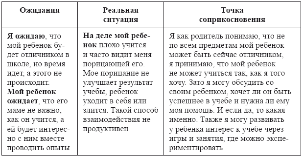 Где же найти неконфликтное место соприкосновения наших стратегий воспитания и детских моделей поведения? В осознанном отношении родителей к своей роли в воспитании дошкольника и понимании того, зачем надо именно в эту минуту именно так реагировать на поведение ребенка (табл. 1). Когда родитель может осознанно (на время) отдать свою ведущую роль ребенку.