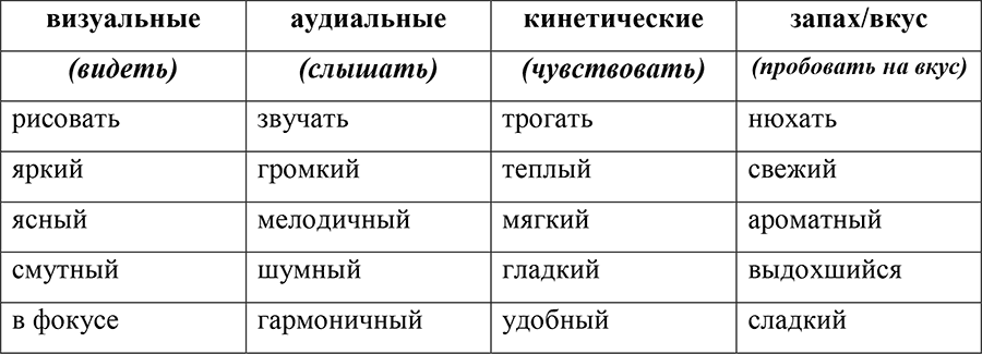 – Нейролингвистическое программирование – средство эффективного воздействия, которое используется повсюду. Известно, что человек получает информацию по многим каналам (аудио, визуальный и т. д.), но для каждого присуще иметь один доминирующий (ведущий) канал. Мы так сориентированы на него, что чаще всего общаемся с окружающими и словами из набора этого канала.