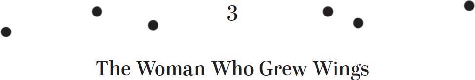 The woman looks over her shoulder and there they are: majestic porcelain-white feathers, over a thousand of them in each wing, she has a seven-foot wingspan. By tensing and untensing her back muscles she discovers that she can control her wings, that all this time her body was working in preparation for flight. Her primary wings are at the tips of her fingertips. Her daughter squeals with delight, her son clings to her tightly, wary of the women staring at them.