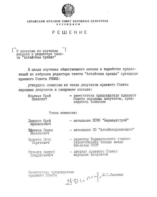 РЕШЕНИЕ ПРЕЗИДИУМА АЛТАЙСКОГО КРАЕВОГО СОВЕТА НАРОДНЫХ ДЕПУТАТОВ О КОМИССИИ ПО ИЗУЧЕНИЮ ВОПРОСА О РЕДАКТОРЕ ГАЗЕТЫ «АЛТАЙСКАЯ ПРАВДА»[5]