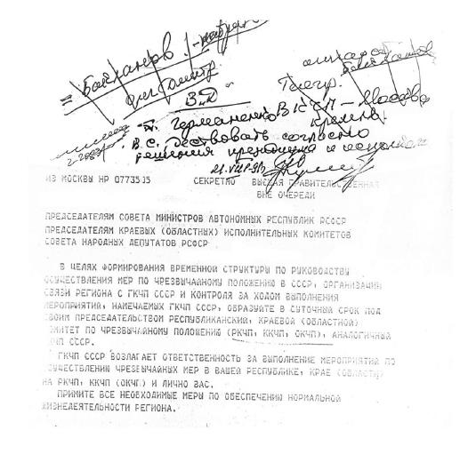 В СВЯЗИ ВВЕДЕНИЕМ ЧРЕЗВЫЧАЙНОГО ПОЛОЖЕНИЯ ПРИМИТЕ МЕРЫ УЧАСТИЮ ЧЛЕНОВ БЮРО ВЫБОРНОГО ПАРТИЙНОГО АКТИВА КОММУНИСТОВ ПРОВЕДЕНИИ ТРУДОВЫХ КОЛЛЕКТИВАХ РАЗЬЯСНИТЕЛЬНОЙ РАБОТЫ ПОДДЕРЖКУ И СОДЕЙСТВИЕ ГОСУДАРСТВЕННОМУ КОМИТЕТУ ЧРЕЗВЫЧАЙНОМУ ПОЛОЖЕНИЮ СССР В ПРАКТИЧЕСКОЙ ДЕЯТЕЛЬНОСТИ СТРОГО РУКОВОДСТВОВАТЬСЯ КОНСТИТУЦИЕЙ СОЮЗА ССР ЗАКОНАМ СССР О ПРАВОВОМ РЕЖИМЕ ЧРЕЗВЫЧАЙНОГО ПОЛОЖЕНИЯ ПЛЕНУМ КРАЙКОМА КП РСФСР ПЕРЕНОСИТСЯ СРОКИ СООБЩИМ ДОПОЛНИТЕЛЬНО= СЕКРЕТАРЬ АЛТАЙ-КРАЙКОМПАРТА РСФСР САФРОНОВ HP 65-