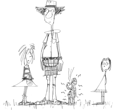 First was Old Granny, then Martin Launderette, then the little girl called Peter, a little boy called Rita and a baby called Elsie Wa-Wa. Then a really, really tall bloke called Harry Extreemoleg, then Thora Gruntwinkle with Greasy Ian and their pet monkey Philip the Horror, and then Jonathan Ripples, who got stuck in the archway and had to quickly go on a diet for ten minutes until he’d lost enough weight to squeeze through. Then came David Casserole (the Town Mayor), followed by Charlotte Casserole (his beautiful wife) and Frank Casserole (his beautiful husband). Next was Beany McLeany, wearing a bikini and reading a magaziney. After him came Pamela, Pamela, Pamela, Pamela, Pamela, Pamela, Pamela, Pamela, Pamela and Pamela – or ‘The Pamelas’ as they were known for short. Then came another Pamela who didn’t count with the other Pamelas, because none of them liked her.