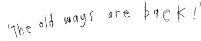 But just then there was an almighty ruckus and a rickus and a buckus and a bickus as over the hill came the crowd of townsfolk, with Old Granny leading the way. And each and every one of those townsfolk – whether young or old, rich or poor, tall or short, thin or Jonathan Ripples – each and every one of them was chanting ‘The Old Ways are back!’