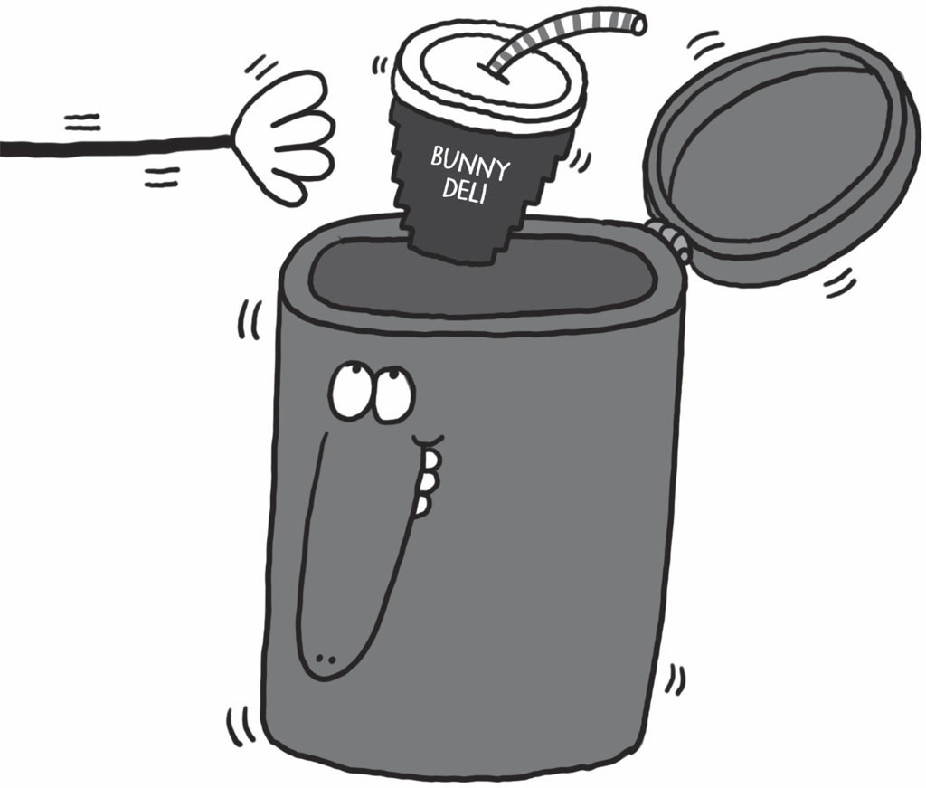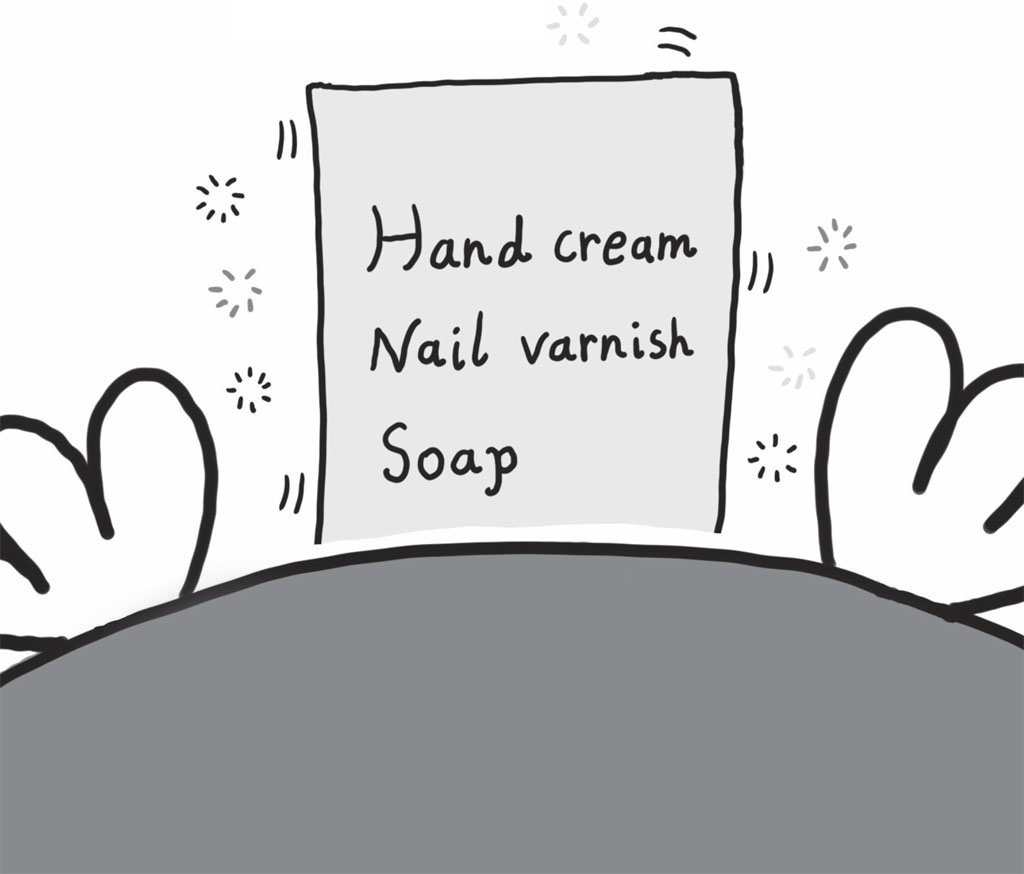 ‘Anywaaay . . .’ said Twoface, squirting another splurt of walnut and pavement flavour chocolate milk into his mouth. ‘I’d love to stand around here all day talking about bins, but we’ve got hand care products to buy.’