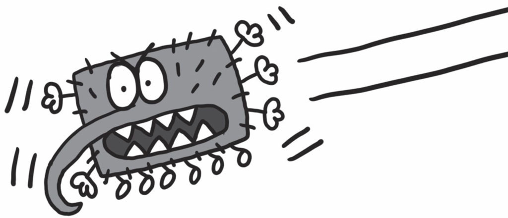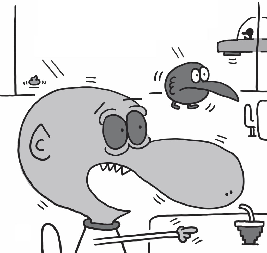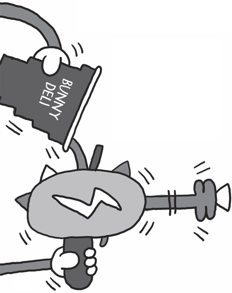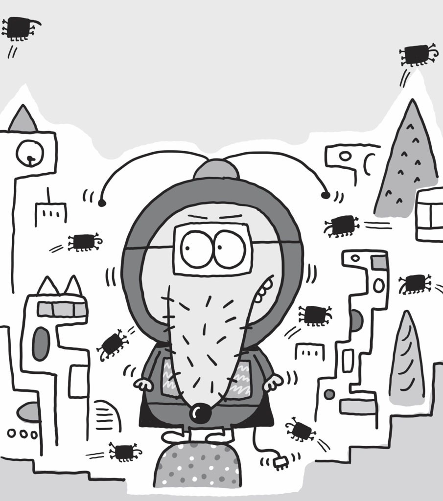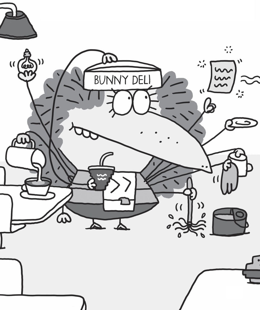 ‘Hairy flying thing!’ blurted Splorg, who’s scared of hairy flying things. ‘Argh! Keep it away from me!’ He jumped out of his chair and ran into the little bathroom at the back of Bunny Deli. ‘Has it gone yet?’ he whimpered from behind the door.