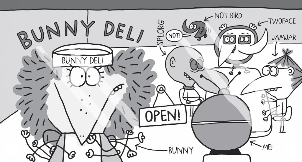 I was sitting in Bunny Deli with my best friends Twoface, Jamjar and Splorg. Oh yeah, and my sidekick Not Bird too.