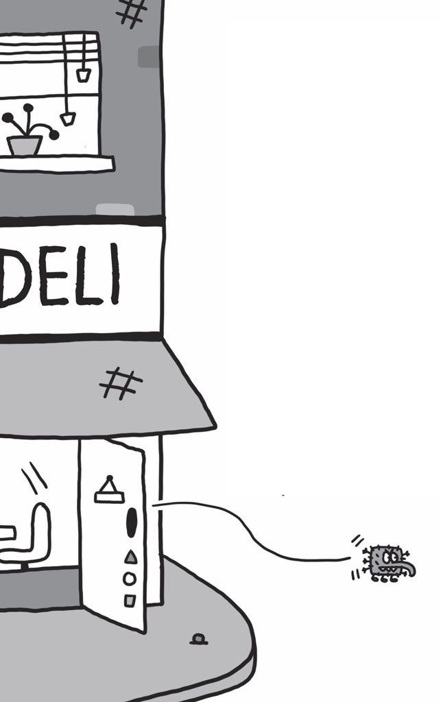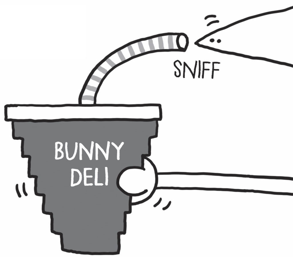 The insect paused, its jaws wide open. Its eyes swivelled round to look at Bunny, and its long curly nose did a sniff. ‘NOM NOM?’ it squeaked, leaping off Twoface’s left nose and flying out of Bunny Deli.