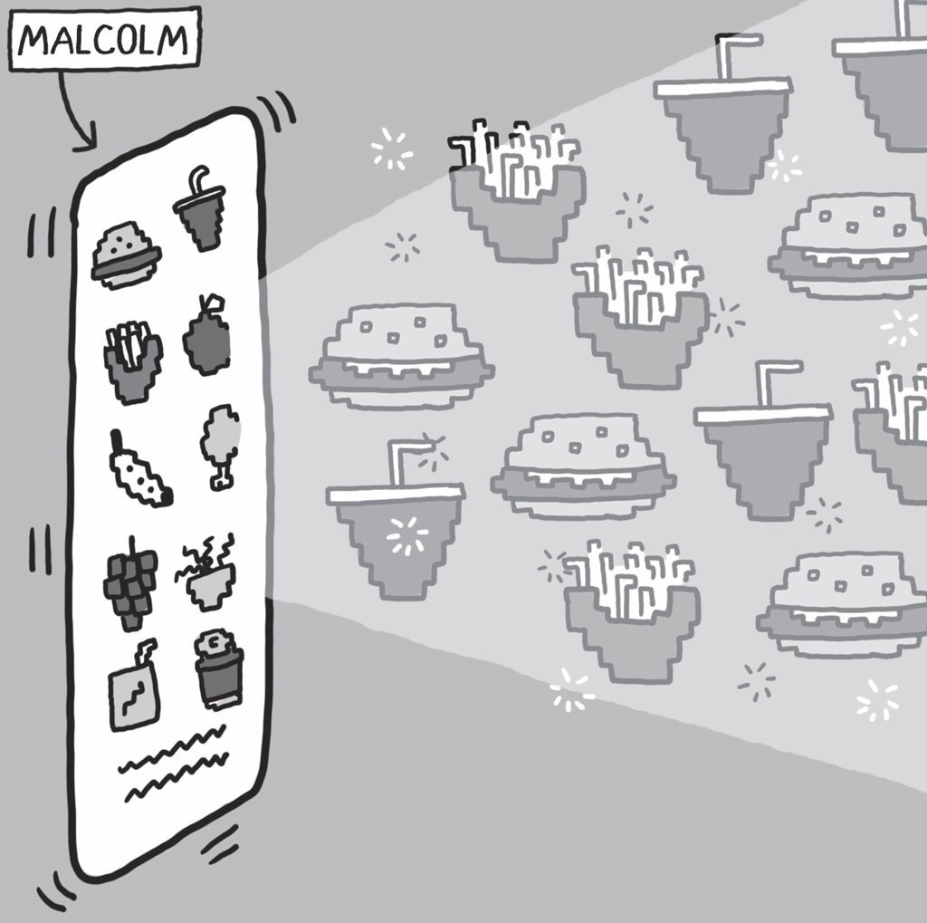 ‘Coming right up!’ said Malcolm, the official Bunny Deli Smellnu, and four Cheesebleurgher Meal Deals fizzled to life in front of our eyes.