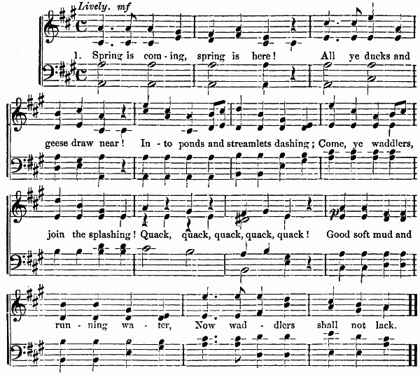 "Where have you been, little birdie,—Where have you been so long?""Warbling in gleeFar o'er the sea,And learning for you a new song,My sweet,—Learning for you a new song.""Why did you go, little birdie,—Why did you go from me?""Winter was here,Leafless and drear;And so I flew over the sea,My sweet,—So I flew over the sea.""What did you see, little birdie,—What did you see each day?""Sunshine and flowers,Blossoms and bowers,And pretty white lambkins at play,My sweet,—Pretty white lambkins at play.""Who kept you safe, little birdie,—Who kept you safe from harm?""The Father of all,Of great and of small:He sheltered me under his arm,My sweet,—Under his dear, loving arm."George Cooper.THE DUCKS AND GEESE