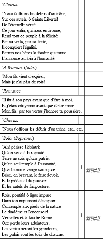 The Introduzione of Pleyel's composition is intended to depict the rising of the people. The stringed instruments begin piano. After a little while a low murmuring noise mingles with the soft strains, sounding at first as if from a great distance, and approaching gradually nearer and nearer. Now the wind-instruments fall in, and soon the blowing is as furious as if it were intended to represent the most terrific storm. It is, however, meant to represent the storming of the Tuileries. Fortunately the awful noise soon passes over, and only some sharp skirmishes are occasionally heard. After about a hundred bars of this descriptive fiddling and blowing, the alarm-bells begin – first one, then another, and now all in rapid succession. Suddenly they are silenced by a loud trumpet signal, responded to by a number of drums and fifes. The fanfare leads to a new confusion, through which the melody of some old French military march is faintly discernible. The excitement gradually subsides, and after awhile the stringed instruments alone are engaged, softly expressing the sighs of the wounded and dying. Presently the Royalists make themselves heard with the song, "O Richard, ô mon roi" (from 'Richard Cœur de Lion') which, after some more confusion, is followed by the air, "Où peut-on être mieux?" at the end of which discharges of cannon commence. Another general confusion, depicted by the whole orchestra with the addition of cannon and alarm-bells. Suddenly a flourish of trumpets, with kettle-drums, announces victory, and forms the introduction to a jubilant chorus with full orchestral accompaniment: "La victoire est à nous, le peuple est sauvé!" This again, after some more instrumental interluding, is followed by a chorus with orchestral accompaniment founded on the tune "Ça ira, ça ira," a patriotic song which was, during the time of the Revolution, very popular with the French soldiers. The remaining portion of the composition consists of a few songs for single voices alternating with choruses. As the words are not only musically but also historically interesting, they may find a place here.