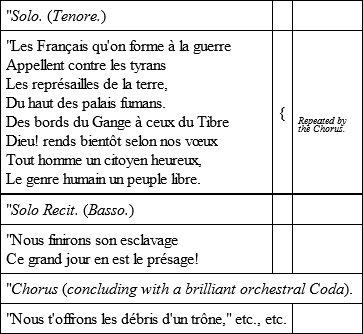 But Pleyel's Republican Hymn of the year 1792 is too characteristic of French taste at the time of the great events which it was intended to celebrate to be left unnoticed. Ignaz Pleyel, the well-known musician, was born in a village near Vienna, in the year 1757. On visiting Strassburg, after a sojourn in Italy, in the year 1789, he was made Kapellmeister of the cathedral. Unfortunately for him, soon his political opinions were regarded with suspicion by the National Assembly, especially from his being a native of Austria. He found himself in peril of losing his liberty, if not his life. Anxious to save himself, he conceived the happy idea of writing a brilliant musical composition in glorification of the Revolution. He communicated his intention to the National Assembly; it found approval, and he was ordered to write, under the surveillance of a gendarme, a grand vocal and orchestral piece, entitled 'La Révolution du 10 Août (1792) ou le Tocsin allégorique.' The manuscript score of this singular composition was, until recently, preserved in Strassburg, but has now probably perished. A short analysis of its construction will convince the reader that the monster orchestra which Hector Berlioz has planned for the music of the future, and of which he says in prophetic raptures: "Its repose would be majestic as the slumber of the ocean; its agitation would recall the tempest of the tropics; its explosions, the outbursts of volcanoes," was already anticipated by Pleyel nearly a hundred years ago. Pleyel required for his orchestra not only a number of large field-guns, but also several alarm-bells. The financial condition of France at that period, and the abolition of divine worship, induced the National Assembly to decree the delivering up of all the church-bells in Alsace. About 900 bells were consequently sent to Strassburg. Pleyel selected from them seven for the performance of his work; and all the others were either converted into cannon, or coined into money – mostly one-sol and two-sol pieces.