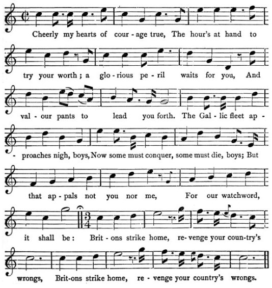 BRITONS TO ARMS!!!Written by Wm. Thos. Fitzgerald, Esqr.,And Recited by him at the Annual Meeting of theLiterary Fund, at Greenwich14 July, 1803Britons to Arms! – of apathy beware,And let your Country be your dearest care;Protect your Altars! guard your Monarch’s throne,The Cause of George and Freedom, make your own!What! shall that England want her Sons’ support,Whose Heroes fought at Cressy – Agincourt?And when great Marlborough led the English Van,In France, o’er Frenchmen triumphed to a man!By Alfred’s great, and ever honoured, Name!By Edward’s prowess, and by Henry’s fame!By all the generous Blood for Freedom shed,And by the Ashes of the Patriot Dead!By the bright Glory Britons lately won,On Egypt’s Plains, beneath the burning Sun!Britons to Arms! defend your Country’s Cause,Fight for your King! your Liberties; and Laws!Be France defied, her slavish yoke abhor’d,And place your safety only on your Sword.The Gallic Despot, sworn your mortal Foe,Now aims his last, – but his most deadly blow;With England’s Plunder tempts his hungry Slaves,And dares to brave you, on your Native Waves!If Briton’s right be worth a Briton’s care,To shield them from the Son of Rapine – swear!Then to Invasion be defiance giv’n —Your Cause is just – approv’d by Earth and Heaven.Should adverse winds our gallant Fleet restrain,To sweep his ‘bawbling82 vessels’ from the main;And Fate permit him on our Shores t’advance —The Tyrant never shall return to France;Fortune, herself, shall be no more his friend,And here the Hist’ry of his Crimes shall end —His slaughter’d Legions shall manure our shore,And England never know Invasion more.This was the stilted sort of stuff given to our forefathers, to inflame their patriotic zeal, and this example is of good quality compared to most. Here is another one, which I give, as having the music, published July 30, 1803: —