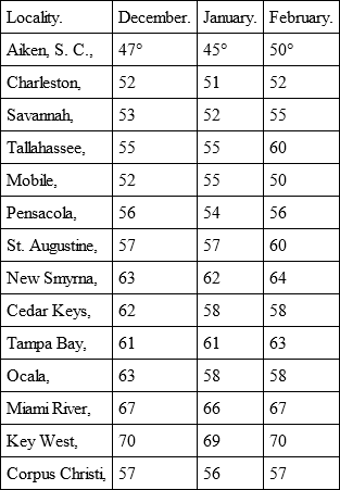 I shall dismiss the second condition in a few words. Moist warmth is soothing; dryness is irritating; every one who has worn a poultice knows this. A moist, warm air, moderately charged with vapor, or even approaching a saturated condition, is therefore, as a rule, most agreeable to the air passages, and the general comfort. In winter, all along our southern seaboard the air is moist; it is sufficiently warm and moist both, nowhere but in southeastern Florida, as the table of winter temperatures shows us.