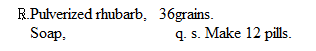 Many persons, in traveling, become constipated. This is best avoided by diet. The favorite Southern breakfast dish, “corn grits,” is an admirable laxative. Corn bread with molasses, fruit early in the day, or a glass of saline mineral water where it can be had, will generally be sufficient. If these fail, one of the ordinary compound cathartic pills can be taken before sleep, or one of the following before a meal: