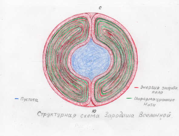 Как было отмечено ранее, внутренние слои структур, образующих вихрь, огибают с огромной скоростью Ядро Пустоты Зародыша Вселенной, вращаясь вокруг него по спирали поднимаются вверх, а вылетая из верхнего полюса, продолжают вращаться в том же направлении. Но за счёт мощного притяжения к Ядру Пустоты, получают дополнительный момент ускорения этого вращения, направленный вниз, навстречу внутреннему слою. Вращение внешнего слоя по спирали навстречу внутреннему слою создаёт условия для роста структур Зародыша Вселенной.