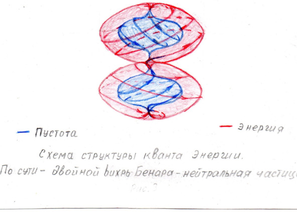 Сближение их друг к другу по одной оси вращения происходит за счёт переплетения совпадающих по направлению потоков Энергии внутреннего слоя нижнего вихря с внешним слоем верхнего, а внутреннего слоя верхнего вихря с внешним слоем нижнего вихря. По свойству гироскопов такие вращения притягиваются друг к другу. В результате такого объединения образуется двойной тороидальный вихрь с двумя ядрами – квантами Пустоты, у которых внешние слои квантов Энергий, вращаясь по спирали, расходятся в разные стороны, а внутренние при этом сходятся. Такая конструкция частицы – кванта Энергии делает её нейтральной, как по заряду, так и по гравитации. А наличие в ней двух ядер делает её более устойчивой, энергетически долговечной, стойкой и неделимой.