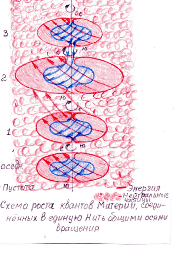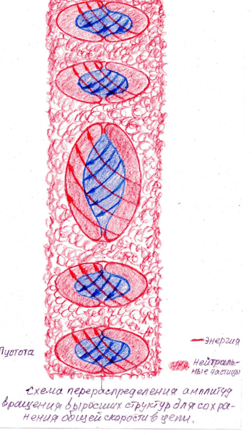 Таким образом, в первые моменты роста квантов Материи в Информационно-энергетических Нитях зарождаются два важных процесса. Происходит, с одной стороны, «впитывание» энергии двойными вихрями – нейтральными частицами, которые при этом расширяясь, уменьшают свою плотность в пространстве Зародыша Вселенной, а, с другой стороны, уплотняется Энергия в растущих квантах Материи с выделением тепла и уменьшением скорости вращения общей цепи с одновременным восстановлением единой для всех путём уменьшения радиуса вращения и расширения каждой из них вдоль оси.